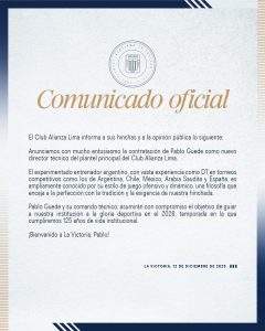 Mediante sus redes sociales, el equipo victoriano publicó lo siguiente: «Anunciamos con mucho entusiasmo la contratación de Pablo Guede como nuevo director técnico del plantel principal del Club Alianza Lima“, se lee en los primeros párrafos.